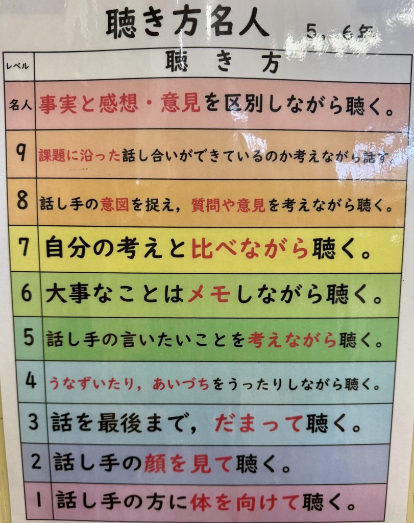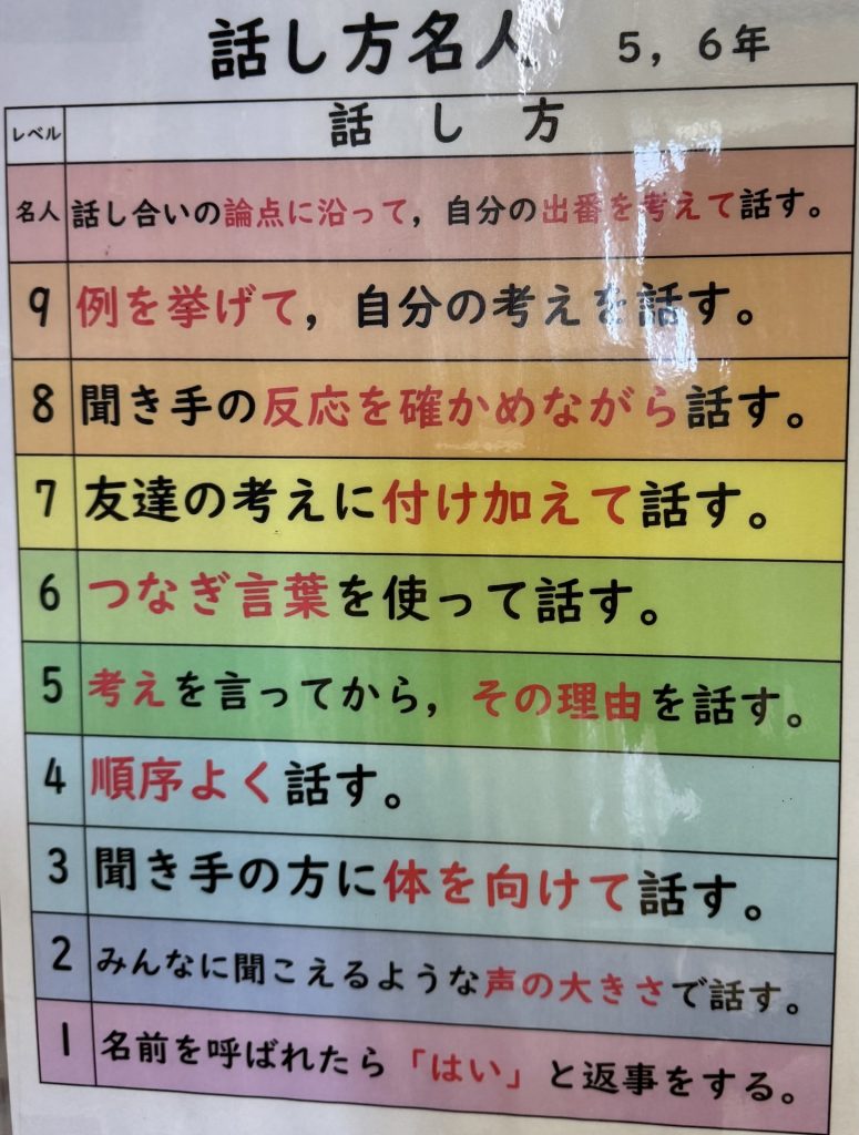 挨拶をする、掃除をする、相手を思いやる、約束を守る、一生懸命取り組む、考えて工夫する、周りの人と協力して取り組む。